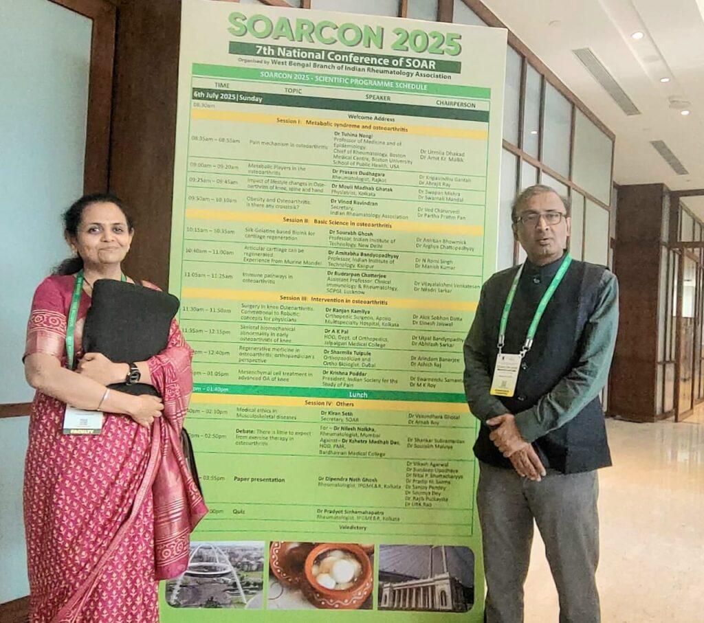 কলকাতা -শুভ ঘোষ রিপোর্ট – ইন্ডিয়ান রিউমাটোলজি অ্যাসোসিয়েশনের পশ্চিমবঙ্গ শাখা এবং SOAR (সোসাইটি ফর অস্টিও আর্থ্রাইটিস রিসার্চ) এর যৌথ উদ্যোগে তিন দিনব্যাপী চিকিৎসকদের সপ্তম জাতীয় সম্মেলন অনুষ্ঠিত হলো কলকাতায়। উপস্থিত ছিলেন ডক্টর পরাশর ঘোষ এইচ ও ডি এস এস কে এম, ডঃ পঙ্কজ মন্ডল ডক্টর আসল ঘোষ ডক্টর আরেন হালদার ডক্টর কিরণ শেখ ডক্টর বিশ্বজিৎ ঘোষ প্রমুখ বিশেষজ্ঞ চিকিৎসকরা।প্রথম দিন ওয়াকসপ অনুষ্ঠিত হলো এসএসকেএম অস্ট্রিও আর্থ্রাইটিস সুপার স্পেশালিটি বিল্ডিং এ। এবং দুদিনের কনফারেন্স অনুষ্ঠিত হলো আই টি সি সোনারে উপস্থিত ছিলেন প্রায় ৫০০ এর বেশি চিকিৎসক। হাঁটু ব্যথা হলেই হাঁটু বদলে ফেলতে হবে। বয়স হলেই ব্যথা যন্ত্রণা বাত শরীরে বাসা বাঁধবে। এরকম সমস্ত বস্তা পচা ধারণাকে সমূলে উপড়ে ফেলতে হবে। আগে থেকে যত্ন না নিলে কম বয়সেও আর্থারাইটিসের ব্যথা হতে পারে। ঠিক সময়ে ব্যবস্থা নিলে ৮০ বছরেও দিব্যি হেঁটে চলে সুস্থ স্বাভাবিকভাবে থাকা যেতে পারে। দুদিন ব্যাপী এই আলোচনা সভায় প্রায় ৫০০ জন চিকিৎসক যোগ দেন। বিভিন্ন বিষয়ের ওপর কর্মশালা আয়োজন করা হয়।